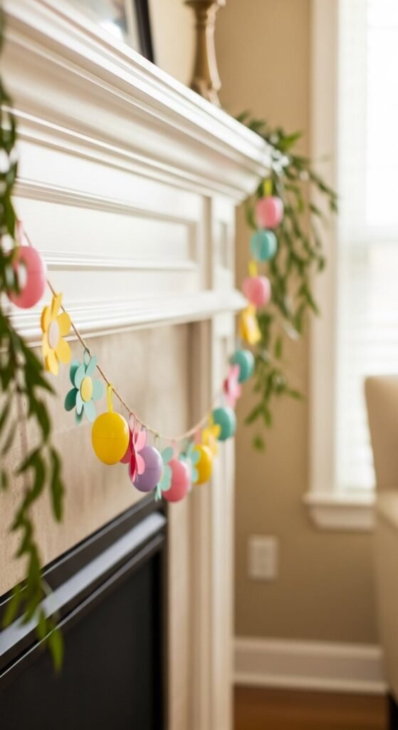 An egg garland is one of the most impactful and underused Easter display ideas. String small plastic eggs and paper flowers alternately along a length of twine using a hot glue gun. Drape it across your mantle, along a dining table edge, or above a window. Choose two or three coordinating colors so it looks intentional. This project takes under an hour and can be made entirely from dollar store supplies. It creates a lot of visual impact for very little money.