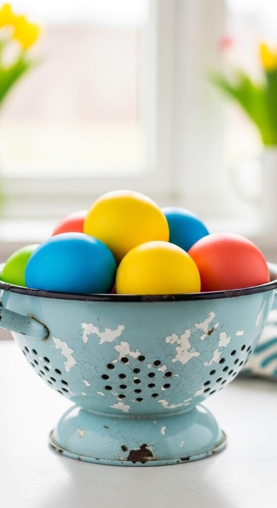 A vintage colander — especially one in a faded pastel enamel — makes a surprisingly charming Easter egg holder. Fill it with brightly colored eggs so the colors pop against the worn metal. The holes in the colander give it a lightness that solid bowls don’t have. Find these at thrift stores for $1–$3. This display works beautifully in kitchens and on buffet tables. It also makes a great Easter gift filled with eggs and wrapped in a ribbon.