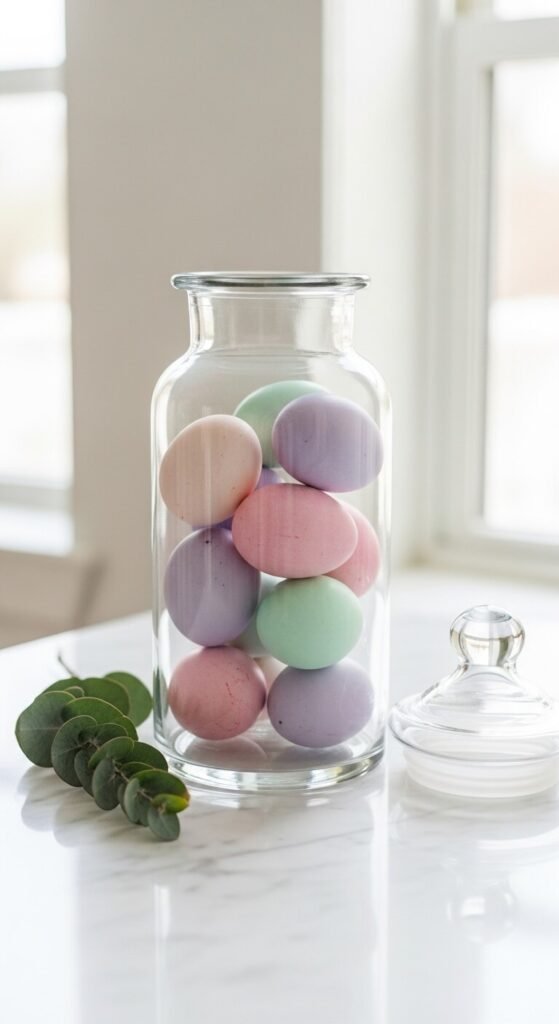 Glass jars are cheap and easy to find. Fill a large apothecary jar with dyed eggs and set it on your kitchen counter or mantle. Layer colors intentionally — alternate light and dark shades for contrast. You can find apothecary jars at dollar stores or thrift shops. Add a sprig of eucalyptus or fake moss on top for a finished look. This display takes less than five minutes and looks like something out of a home décor magazine.