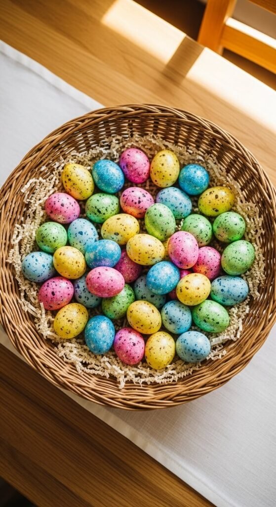 You probably already own a wicker basket. Fill it generously with eggs in a mix of colors and finishes — matte, shiny, speckled, and glittered all work together surprisingly well. Overfill it slightly so a few eggs peek over the top. Add Easter grass or crinkle paper underneath for extra height and texture. Place it in the center of your dining table or on a coffee table. It’s simple, affordable, and completely reusable every year.