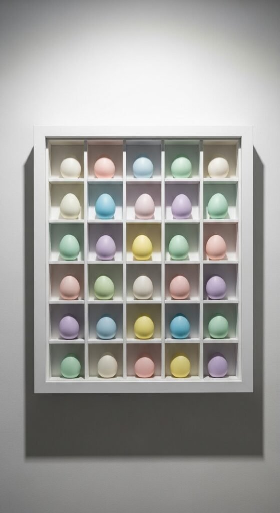 Shadow boxes turn Easter eggs into actual wall art. Arrange eggs in a deep shadow box frame in a grid pattern, one egg per compartment. Use eggs that follow a gradient — from light to dark in a single color — for a contemporary gallery wall look. Hot glue each egg in place. This display is reusable if you use plastic eggs and can hang all season without any upkeep. It’s a conversation starter that feels more like art than décor.