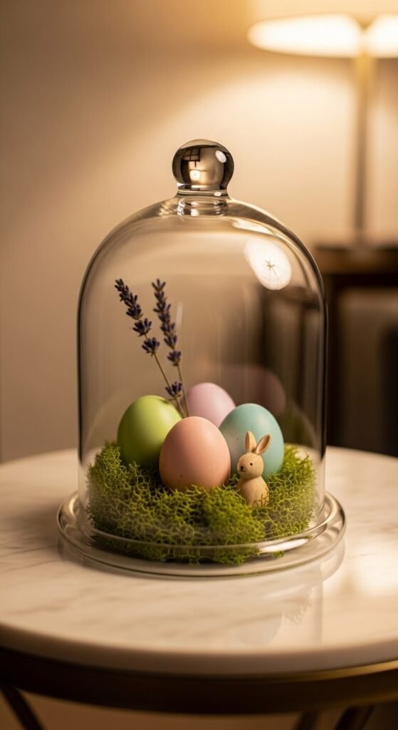 A glass cloche turns a few eggs into a styled vignette that looks like it belongs in a boutique. Arrange two or three eggs on a bed of moss inside the cloche with a tiny prop — a ceramic bunny, a dried flower sprig, or a small nest. The glass dome frames the scene and protects it from dust. Cloches are available at thrift stores and home goods shops for a few dollars. This works on mantles, bookshelves, and side tables.