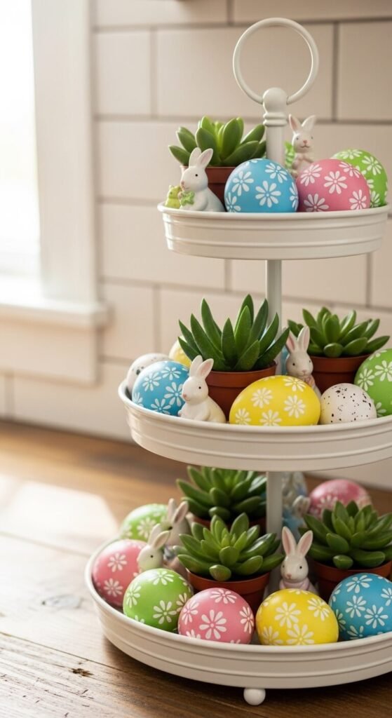Tiered trays are wildly popular for seasonal décor — and Easter eggs were made for them. Place a few eggs on each level and mix in small props like mini bunnies, tiny potted plants, or ribbon bows. Use varying egg sizes across levels for visual interest. Tiered trays are a one-time investment that you can redecorate every season. This display works perfectly on a kitchen counter, dining buffet, or bathroom vanity for a festive touch throughout the house.