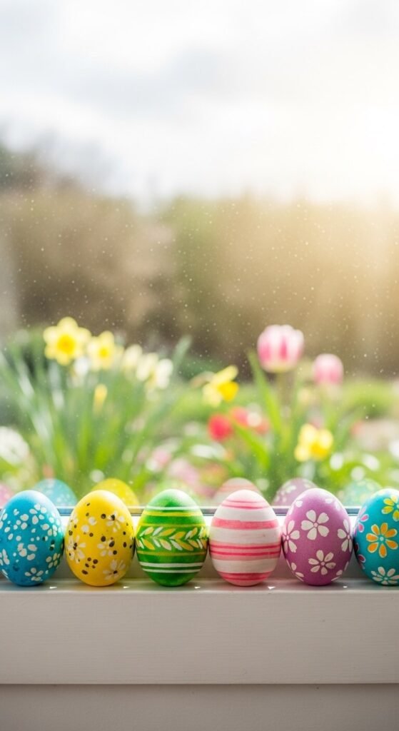 Window sills are free real estate for seasonal décor. Line up a row of eggs from one end of the sill to the other, alternating colors or patterns. The backlight from a window makes the colors glow in a way that no artificial light can replicate. Use plastic eggs so you don’t worry about breakage from sunlight. This display costs nothing if you already have the eggs and looks stunning with zero styling effort.