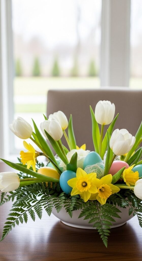 Easter eggs and spring flowers belong together. Nestle a handful of eggs directly into a fresh or faux floral arrangement for a layered, organic look. Use eggs that match or contrast the flower colors. Try tucking plastic eggs into a low bowl arrangement with tulips or daffodils. Real eggs can work too — just handle gently. This adds dimension to a centerpiece that might otherwise look flat and makes the whole display feel cohesive and intentional.