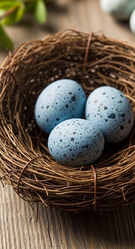 Bird nests make the most natural-looking Easter egg display you can create. Buy faux nests from a craft store (usually under $2 each) and place two or three speckled or blue eggs inside. Group several nests together at different heights using small pedestals, books, or wood slices. This works especially well on a mantle or shelf. The look is organic, cozy, and completely on-theme without being cheesy or over-decorated.