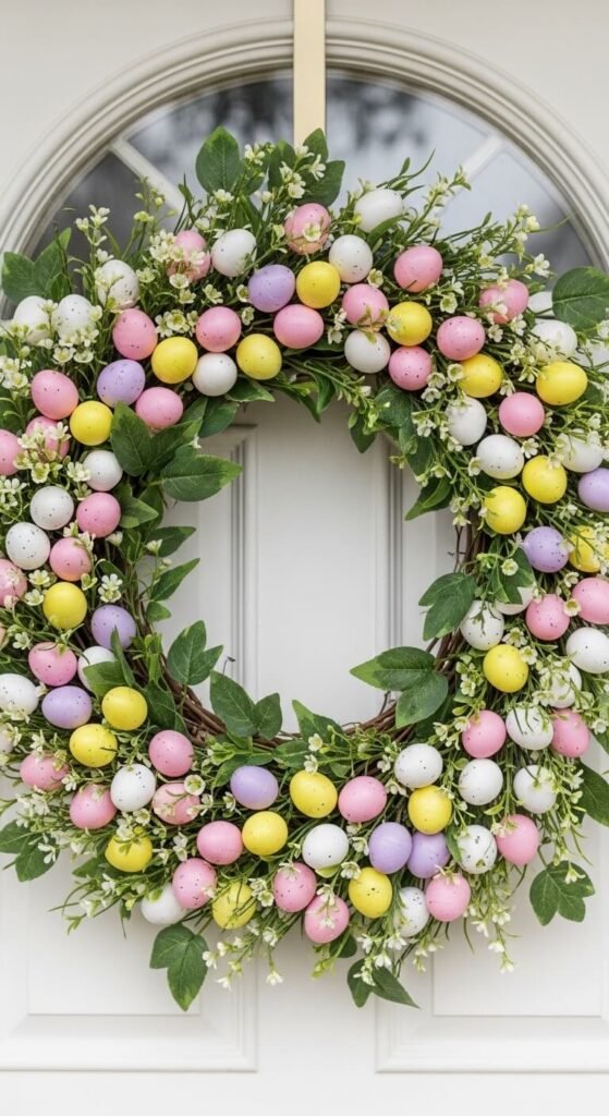 Turn your front door into a statement piece. Hot glue small plastic eggs onto a grapevine or foam wreath base in a color scheme that matches your front door or porch. Fill gaps with faux greenery or ribbon. This project costs under $15 with dollar store supplies. It takes about 30 minutes and lasts the whole Easter season without wilting or fading. Guests will notice it immediately, and it sets the tone for the rest of your Easter décor inside.