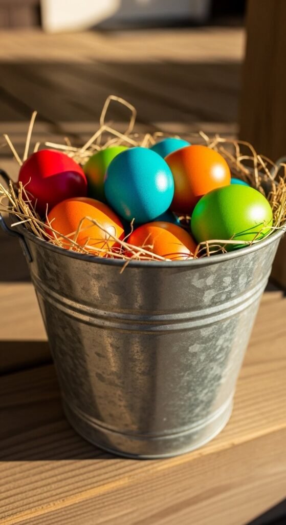 Galvanized metal buckets give Easter eggs an unexpected rustic edge. Fill a bucket with hay, moss, or Easter grass and settle a handful of eggs inside. The contrast between the raw metal and the bright egg colors is striking. These buckets are budget-friendly at dollar stores and farm supply shops. Use one large bucket as a bold porch display or cluster several small ones together inside for a layered farmhouse look that feels relaxed and welcoming.