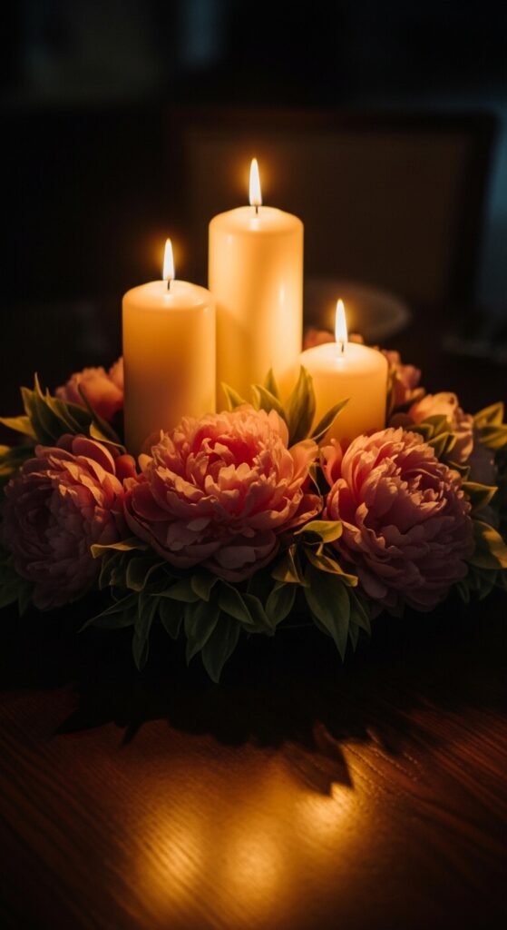 Surround pillar candles with loose peony blooms on a mirrored tray or wooden board. You don’t need to put the peonies in water — they’ll last several hours for a dinner event. Scatter a few petals around the candles too. This arrangement looks like something from a high-end event but takes ten minutes to put together. Use three candles at different heights for visual balance. A mirrored tray underneath doubles the light and makes everything look more polished.