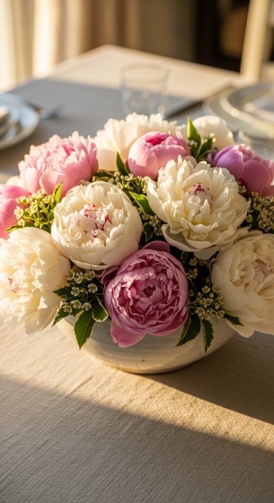 A wide, shallow bowl filled with peony heads makes a stunning dining table centerpiece. Cut the stems short so the blooms sit just above the rim. Mix two or three peony colors for depth. Add a few leaves for contrast. This style works beautifully for dinner parties. It keeps sightlines clear across the table so guests can actually talk. You can find affordable ceramic bowls at thrift stores. The whole arrangement can cost less than $20.