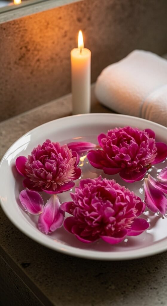 This is one of the easiest peony decor ideas and one of the most dramatic. Pull apart a single bloom and float the petals in a wide bowl of water. Add a floating candle for evening ambiance. Place it on a coffee table, bathroom counter, or dining table. It works beautifully for spa nights or romantic dinners at home. The whole setup costs almost nothing if you already have candles. Use a white or dark bowl so the petal colors really pop.