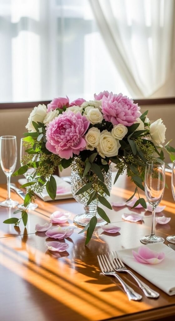 Place 10-15 stems loosely in a pitcher or wide-mouth vase. Don’t overthink the arrangement—garden roses look best slightly wild and overgrown. Remove lower leaves and change water every other day. These typically cost $1-2 per stem, far less than florist roses. The full, cabbage-like blooms fill space quickly, so you need fewer stems. They last up to two weeks if you recut stems and keep water clean. Perfect for bedrooms and living rooms where you want softness.