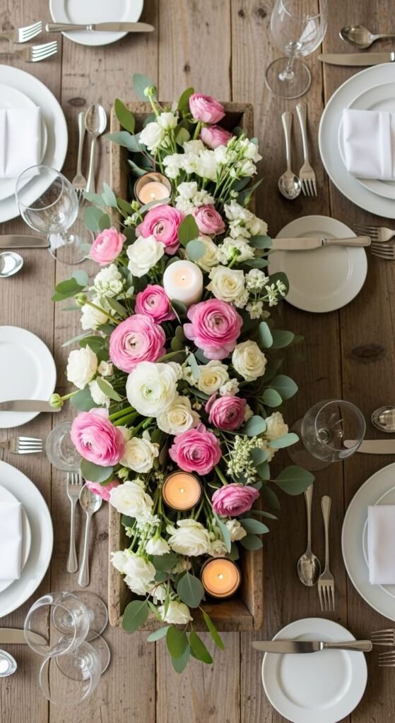 This style feels abundant without blocking conversation. Line up several small vases if you don’t have a long container. Fill gaps with greenery clippings from your yard. Arrange flowers so they face outward in all directions for 360-degree viewing. This technique works for dinner parties, holidays, or everyday use. The horizontal spread makes a small amount of flowers look generous. Use candles between flower clusters for evening ambiance. Remove the arrangement for daily meals and bring it back for special occasions.
