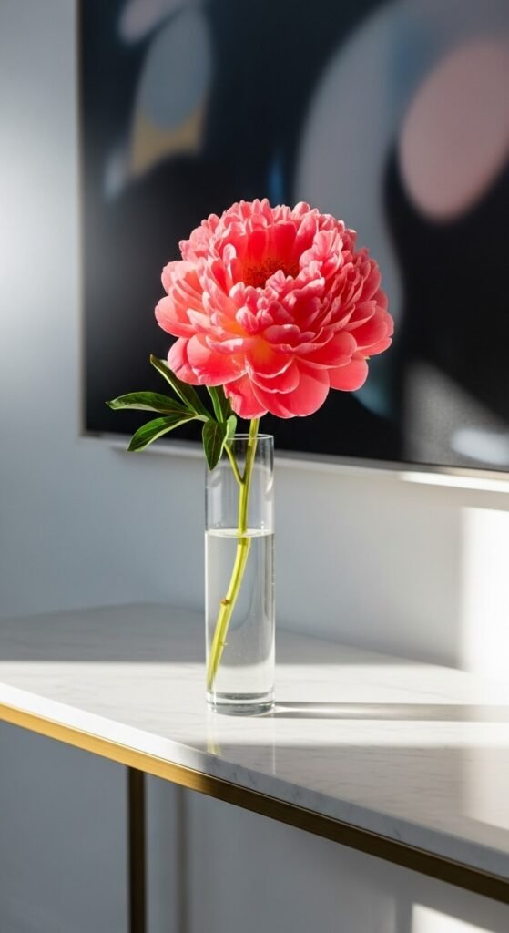 One perfect flower makes a bigger impact than you’d think. Choose a bloom with presence—like a peony, protea, or dinner-plate dahlia. Place it in a narrow vase that supports the stem without crowding.