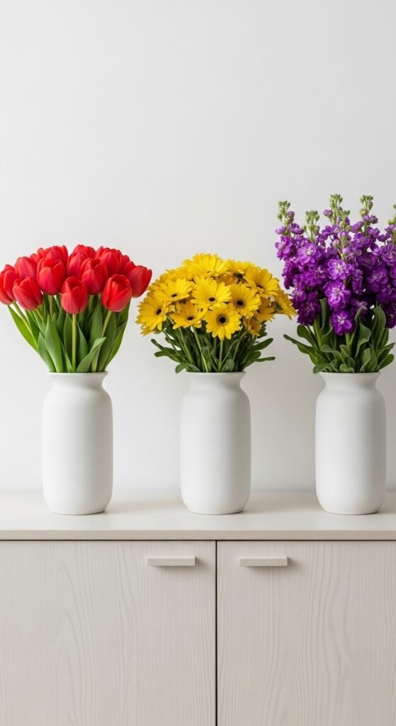 Group multiple vases together, each filled with one flower type in one color. The bold blocks of color create modern, graphic impact. This looks designed and intentional with minimal effort.