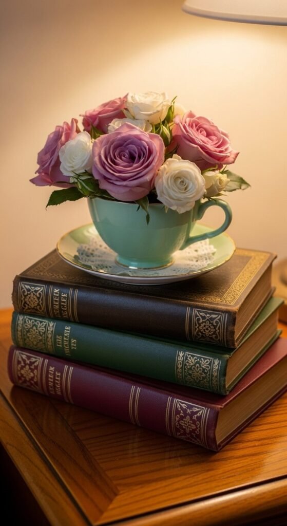 Stack vintage books as pedestals for small flower arrangements. Top the stack with teacups, small bowls, or bud vases filled with blooms. The layered height adds visual interest to flat surfaces.