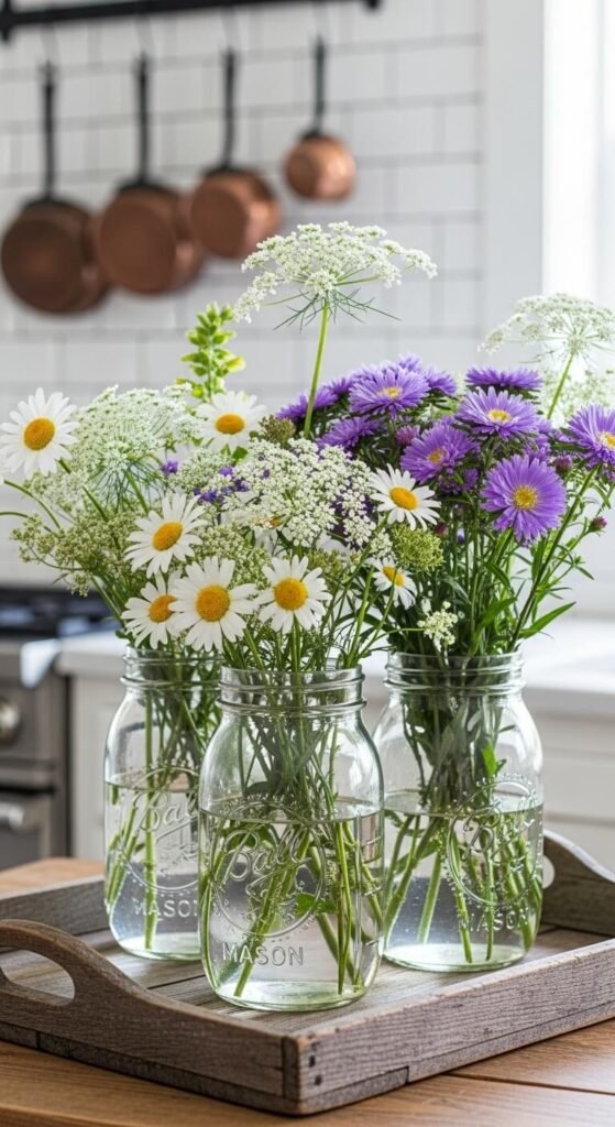 Group three to five mason jars together on a tray for maximum effect. The mismatched, informal style feels welcoming and personal. This works beautifully for outdoor dining tables or kitchen windowsills. Use jars you already own—no need to buy special vases. Change arrangements weekly to reflect what’s blooming. Kids can help gather flowers, making this a fun weekend activity. The loose, unstructured style means you can’t mess it up.