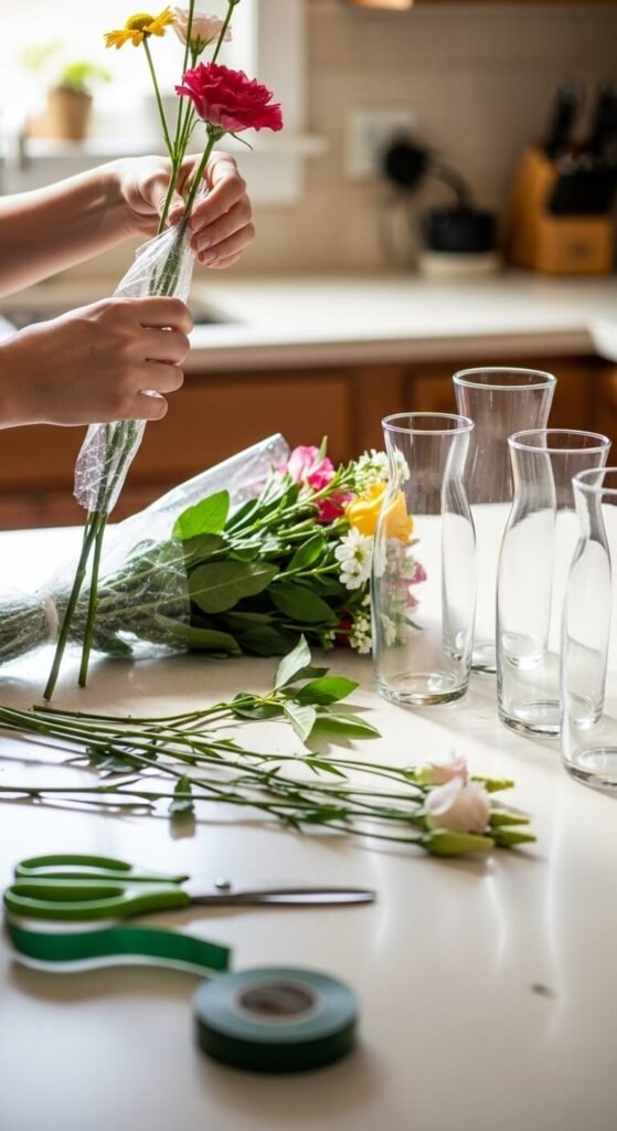 Remove all the filler greens first. Cut stems at varying heights. Group similar colors together rather than mixing everything. Use what you have—coffee mugs, drinking glasses, even cleaned jam jars. This gives you multiple arrangements from one purchase. Place them in your entryway, bathroom, and bedroom. The separated approach looks custom and intentional. Grocery store flowers typically last 7-10 days with proper water changes.