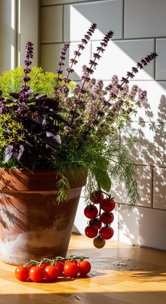 Your kitchen garden doubles as decor. Arrange flowering herbs in simple pots or vases near your cooking area. Basil flowers, rosemary sprigs, mint, and flowering thyme smell incredible and look charming.