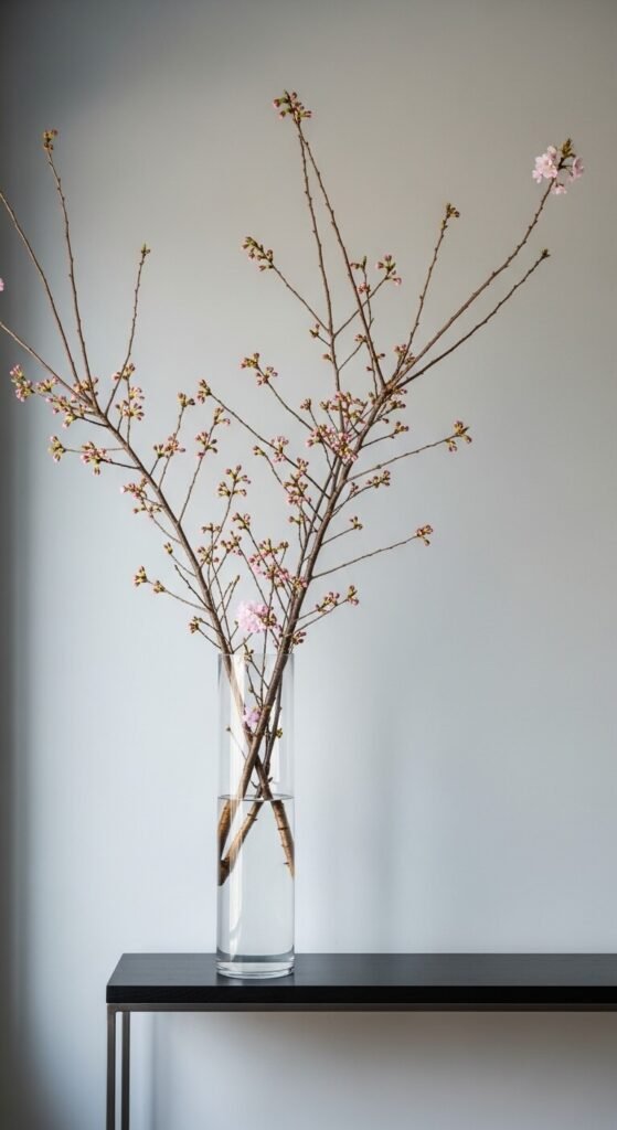 Stand tall branches in weighted vases or pitchers. The vertical lines draw the eye upward and make rooms feel larger. Force branches by cutting them while buds are still tight, then placing them in warm water indoors. Within days, blooms appear. This technique works from late winter through early spring. One branch can provide two weeks of changing beauty as buds slowly open. Clean the vase weekly and trim stems to prevent bacterial growth.