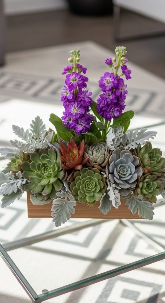 Succulents provide permanent structure while flowers add seasonal color. Water tubes (available at craft stores for under $5) keep cut stems hydrated. This works especially well for coffee tables and dining centerpieces. When flowers fade, replace just those stems while succulents stay put. The textural contrast between soft petals and geometric succulent shapes adds visual interest. You can create these in shallow bowls, wooden boxes, or ceramic planters.