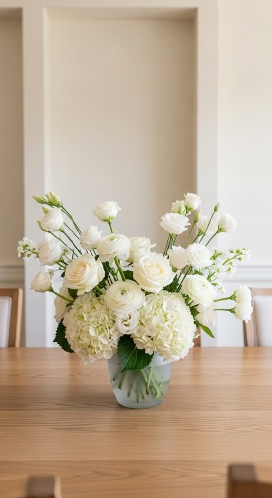 All-white or single-color arrangements look expensive and designer-approved. Choose flowers in one color family but vary the textures and sizes. Mixing roses with ranunculus, hydrangeas, and stock creates depth.