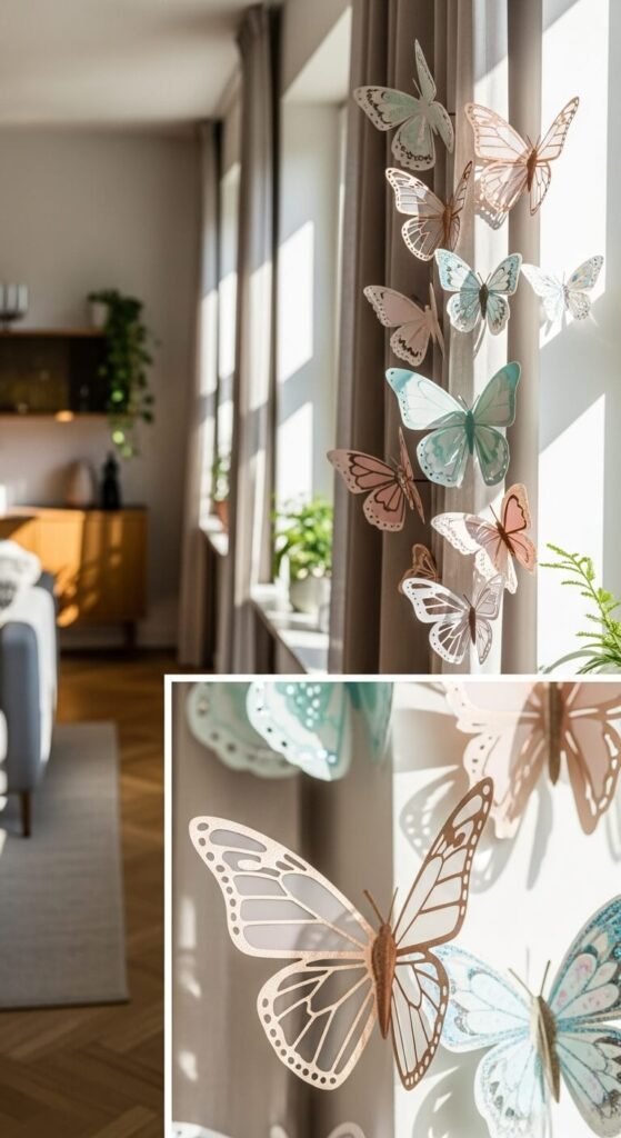 String butterflies on twine or ribbon to drape above doors. Use fabric scraps, felt, or craft foam. Space them 4-6 inches apart for the best look. This works beautifully for parties or as permanent decor. Switch out colors to match holidays—orange for Halloween, red for Valentine’s Day. Hang multiple strands at different lengths for a layered effect. Total cost: about $3 using scrap materials.