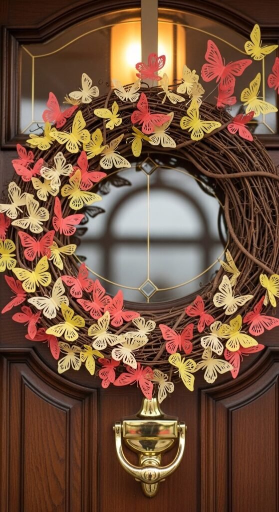 Cover a foam or grapevine wreath form with butterflies. Layer them overlapping for fullness. Choose a color palette that matches your door color. Hot glue works best for attachment. Add a ribbon loop for hanging. Change the butterflies seasonally while keeping the same base. A wreath costs $10-15 to make.