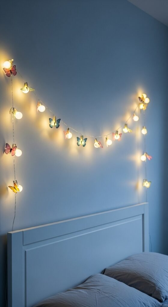 Clip small butterflies onto string lights. Use clothespins or wire to attach them. The lights shine through translucent butterflies beautifully. Drape them around mirrors, headboards, or along ceilings. Battery-operated lights work anywhere. Choose butterflies in colors that glow when backlit. This costs about $12-15 complete.