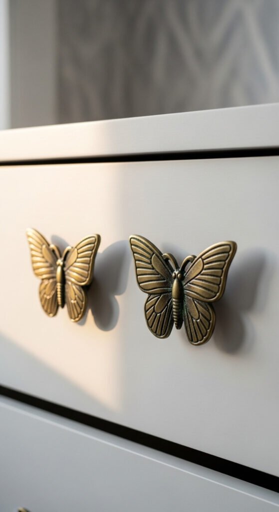 Replace boring drawer knobs with butterfly-shaped hardware. Find these at hardware stores or online for $3-6 each. They come in brass, ceramic, or painted finishes. This small change makes furniture feel custom. Mix butterfly pulls with coordinating round knobs for variety. Installation takes minutes with a screwdriver.