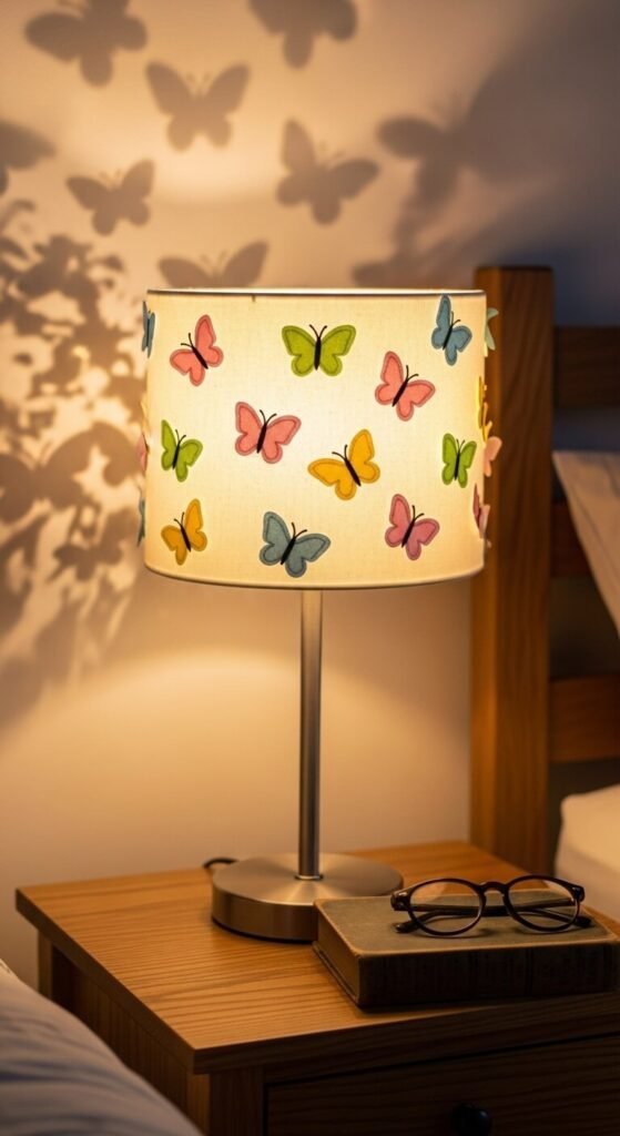 Attach butterflies around lampshade edges or scattered across surfaces. Use fabric glue for secure attachment. When the lamp is on, butterflies create beautiful shadows. Choose materials that won’t scorch near bulbs. Velvet or felt butterflies add texture. This transforms a basic lamp for under $5.