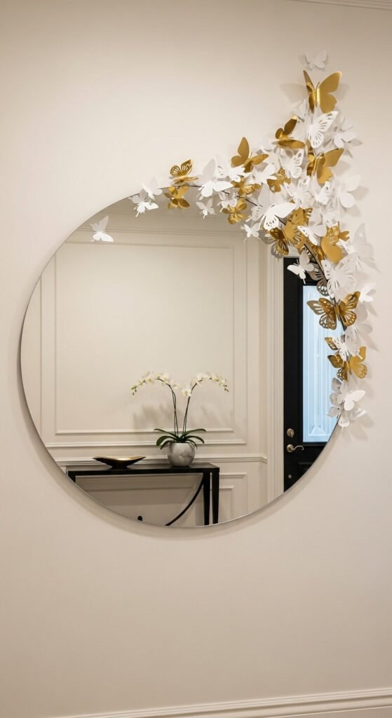 Cluster butterflies around mirror edges. Focus them on one corner rather than spreading evenly for modern style. Use 3D butterflies that cast shadows. This draws the eye upward and makes mirrors feel custom. Change butterfly colors seasonally. Attachment takes just minutes with adhesive dots.