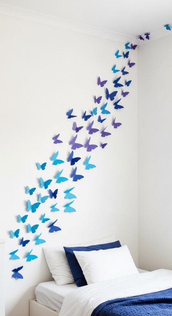 Cut butterflies from cardstock or old book pages for an instant wall feature. Fold the wings slightly for dimension. Attach with small adhesive dots so they float off the wall. Start with 10-15 butterflies in one color family or mix metallics for shimmer. Position them flowing from one corner or clustering around a mirror. Change them seasonally—pastels for spring, jewel tones for fall. This costs under $5 if you use paper you already own.