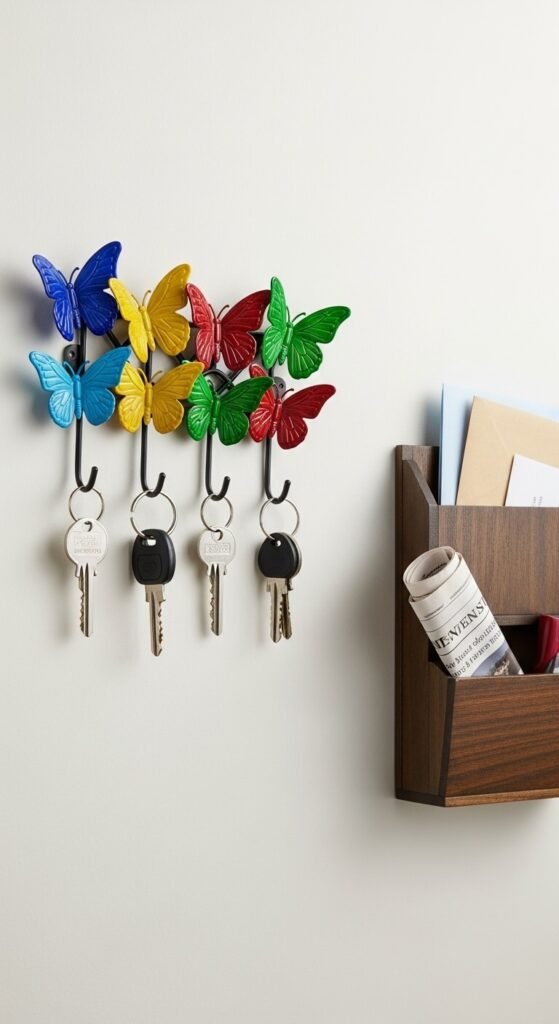 Install butterfly-shaped hooks for keys or jewelry. Mount them near doors for convenient access. These combine function with beauty. Find them in metal, ceramic, or resin. Arrange three to five hooks in a row. They work in entryways, bedrooms, or bathrooms. Each hook costs $4-8.