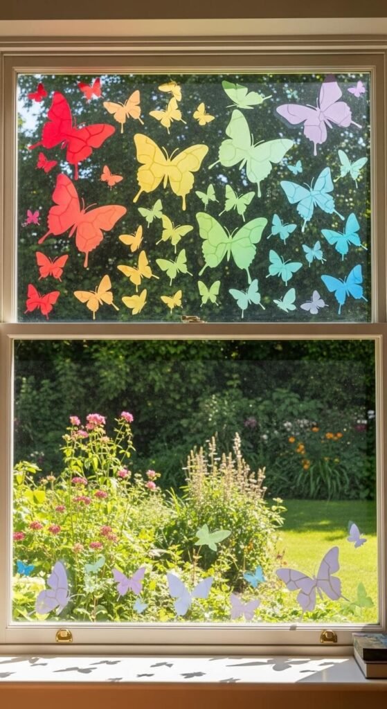 Stick removable clings on windows for sun-catching color. These work perfectly on glass doors too. Arrange them in flight patterns or clusters. The sun shines through creating colorful reflections inside. Kids love helping position these. Remove and reuse them year after year. Sets cost $6-10.