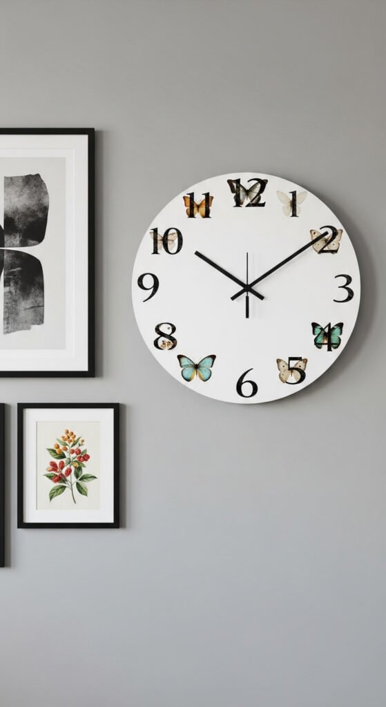 Find clocks with butterfly designs or customize a plain clock. Add butterfly stickers at hour marks for a personal touch. This works in kitchens, offices, or bedrooms. Battery-operated clocks are affordable and easy to hang. Decorative clock faces cost $15-25.
