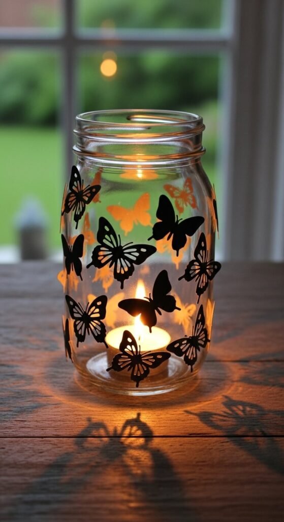 Wrap mason jars with paper featuring butterfly cutouts. Place LED tea lights inside for instant ambiance. The light shines through the butterfly shapes, casting dancing shadows. Use black paper for dramatic contrast or colored tissue for softer effects. Line several along a mantel or windowsill. These make perfect centerpieces for outdoor dinners. Each jar costs about $1 to make.