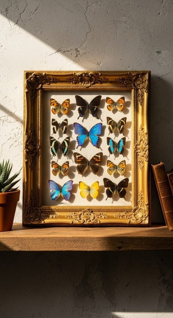 Mount paper or fabric butterflies inside thrift store frames. Arrange them in flight patterns or symmetrical designs. Look for frames under $5 at yard sales. Remove the glass for a dimensional look or keep it for protection. Group different sized frames on one wall for a gallery effect. You can even press real flowers alongside paper butterflies for added texture.