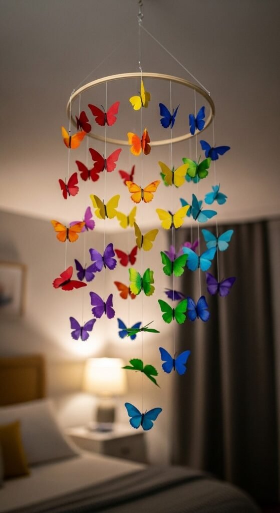 Create movement overhead with a butterfly mobile. Use an embroidery hoop as the base. Attach butterflies with fishing line at varying lengths. Hang near windows where air currents make them spin gently. This works beautifully in bedrooms or reading nooks. Paint the hoop to match your decor or wrap it with ribbon. Materials cost around $6-8.