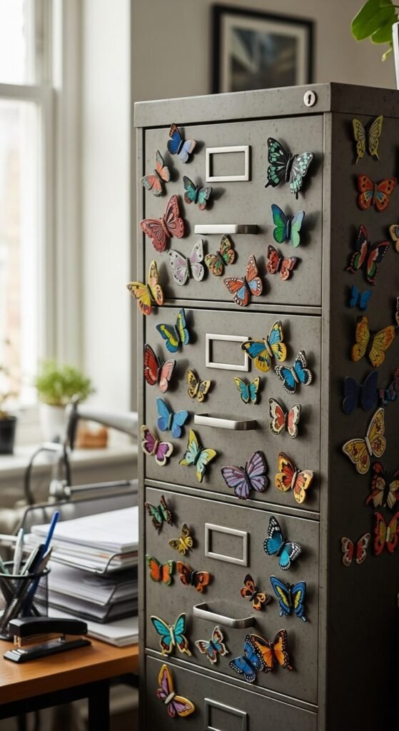 Glue small magnets to the back of butterfly cutouts. Stick them on refrigerators, lockers, or metal shelving. Make them from polymer clay for a custom look or buy wooden butterflies to paint. Kids love rearranging these. Create seasonal collections to swap throughout the year. This project uses materials you likely have on hand.