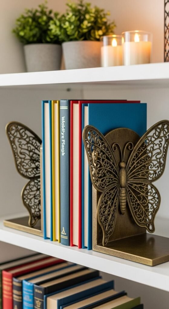 Find metal butterfly bookends at home goods stores or make your own. Spray paint plain bookends and attach butterfly cutouts. These add function and beauty to bookcases. Look for butterfly shapes at craft stores in the unfinished wood section. Paint them in colors that complement your book spines. Expect to spend $8-12 per pair.