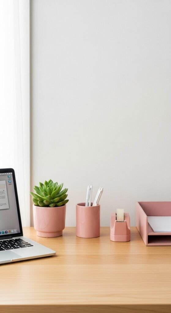 Coordinating desk items create calm in workspaces. Pink accessories feel professional yet approachable.
