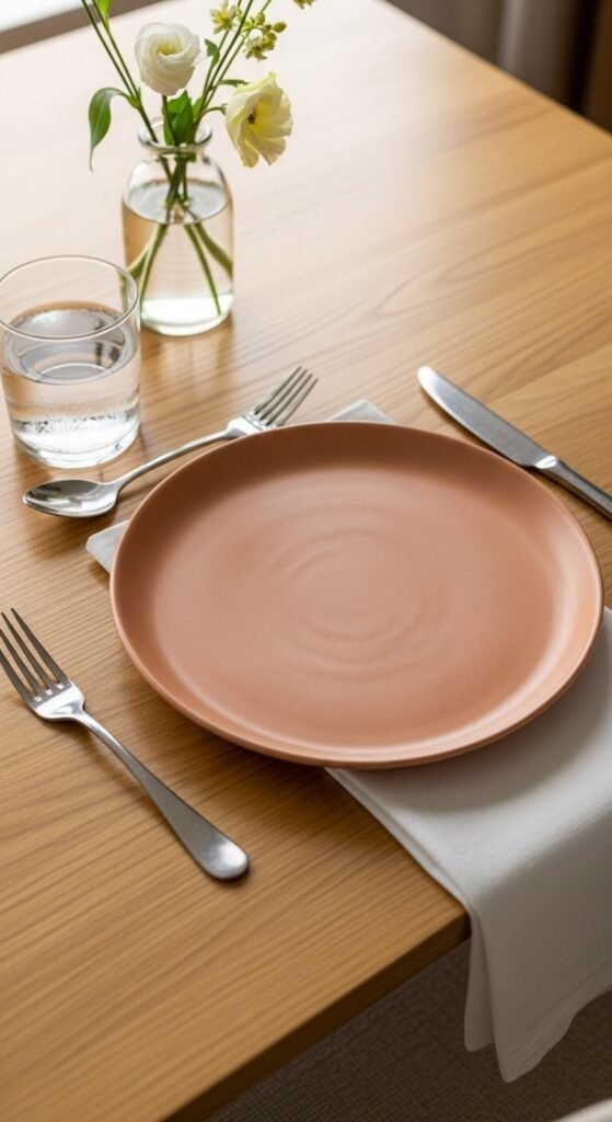 Updating plates transforms everyday meals into styled moments. Peach tones feel warm and appetizing.