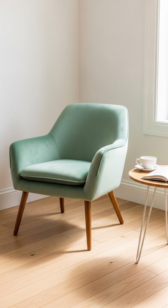 An accent chair anchors reading nooks or fills empty corners. Mint green adds color without dominating small rooms.