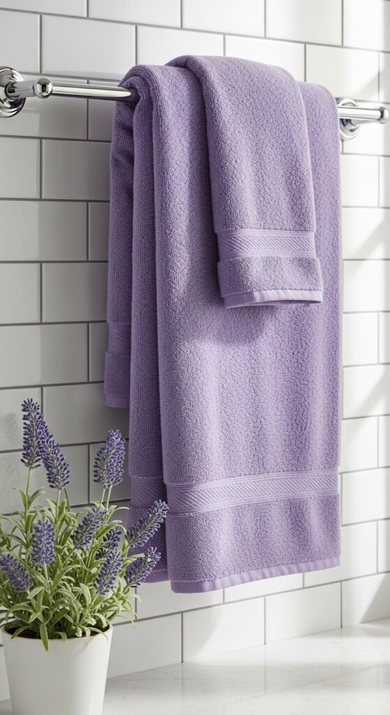 Lavender works with white bathrooms, gray tile, or natural wood vanities. The color hides light stains better than pure white. Hang towels to dry between uses to prevent mildew. Small changes in bathrooms create outsized visual impact.