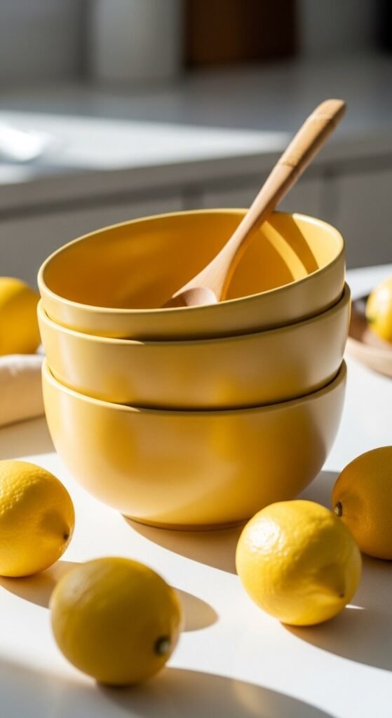Serving bowls double as kitchen decor when displayed openly. Yellow adds cheer to cooking spaces.