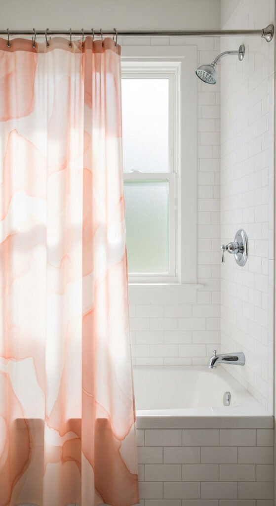 Patterns hide water spots better than solid colors. Peach tones warm up cool tile and fixtures. Wash monthly to prevent mildew. This single change can completely shift how your bathroom feels.