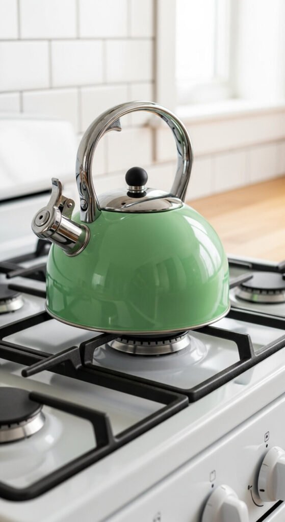 Countertop appliances can be decor pieces. A mint kettle adds color to neutral kitchens while staying functional.
