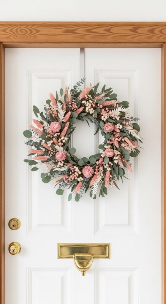 Wreaths welcome guests before they enter your home. Pink versions feel friendly without holiday restrictions.