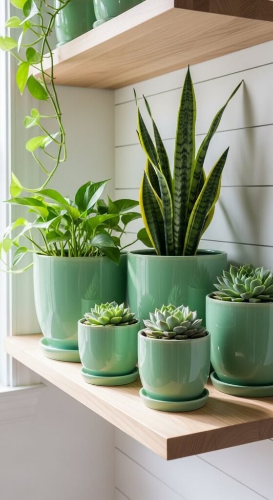 Green planters bring life to shelves and windowsills without paint or major changes. Look for glazed ceramic in soft mint shades.
